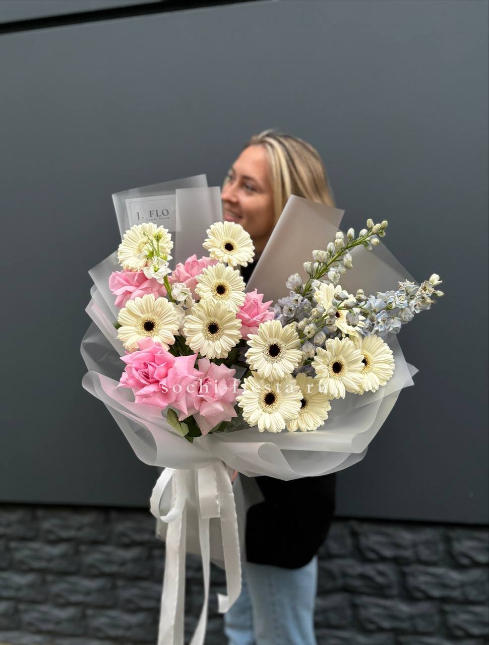 роза, герберы, дельфиниум (замена на маттиолу не в сезон), оформление.