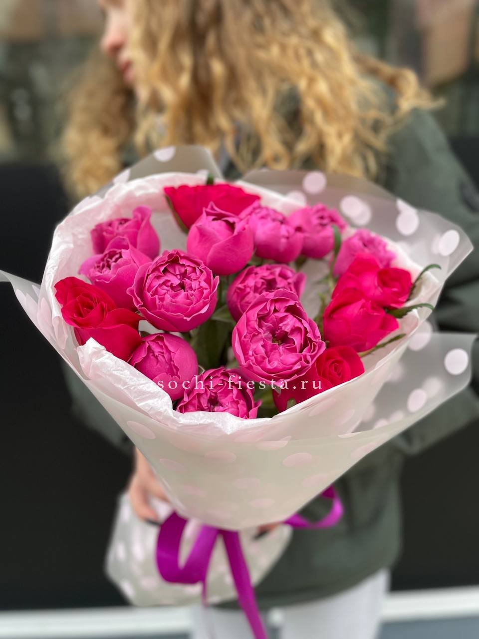 гортензия, пионы, кустовые пионовидные розы, одноголовые розы, дельфиниум (или аналог вне сезона), лента, дизайнерская упаковка.