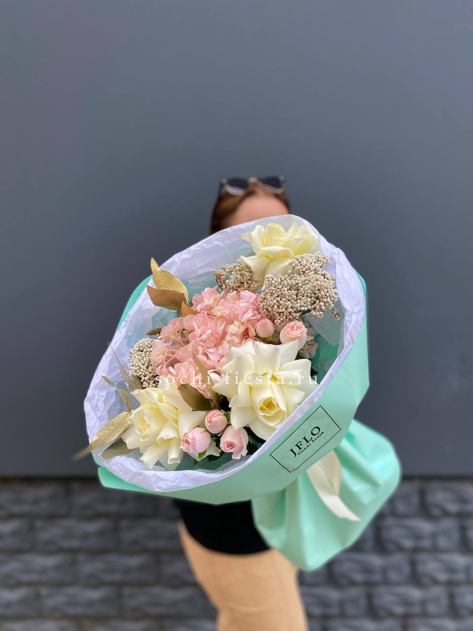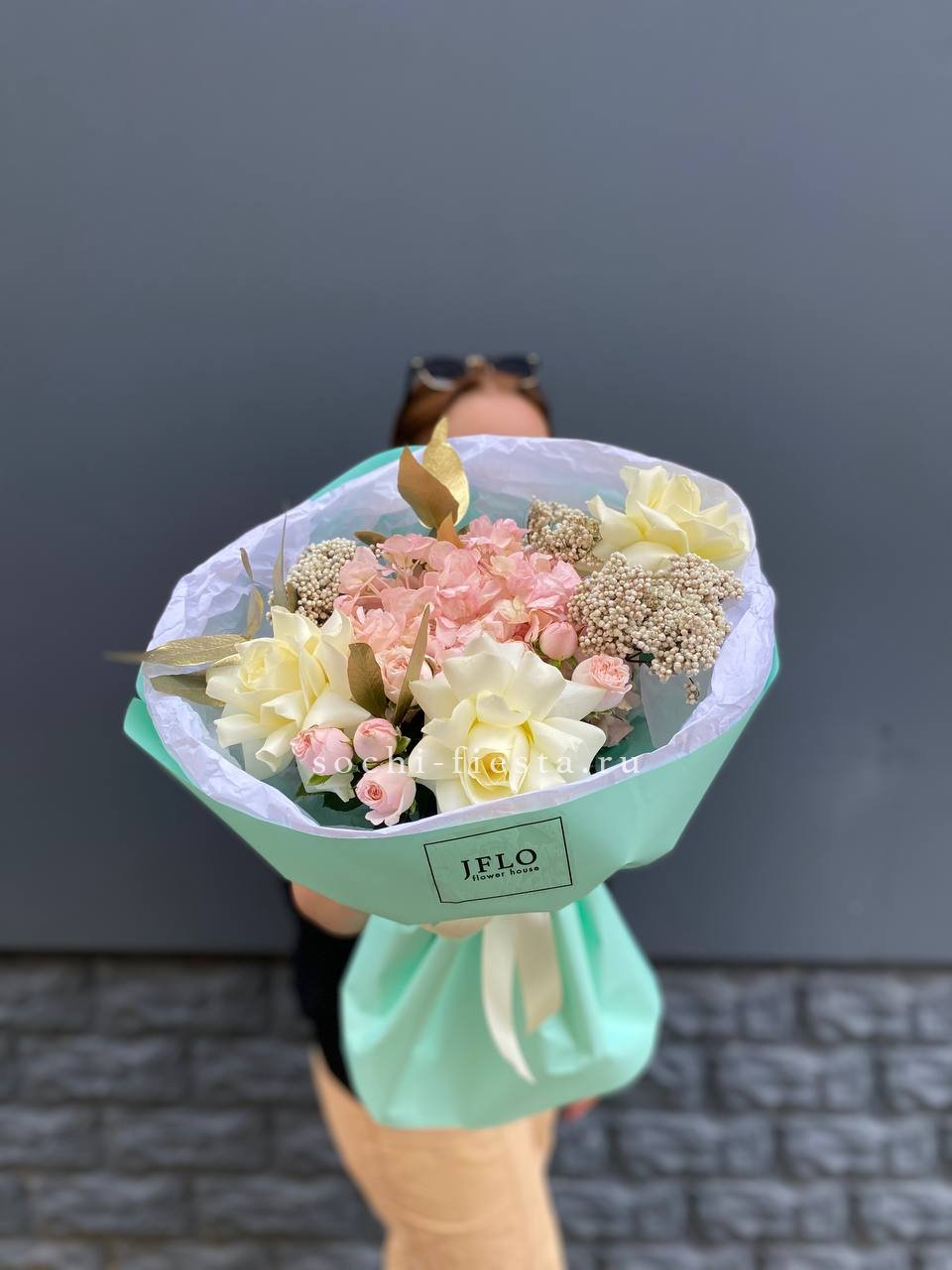 Lucrecia собрана из пионовидных и классических роз с добавлением пушистых кустовых хризантем. Букет легко впишется в современный интерьер и поддержит спокойную эстетику пространства.