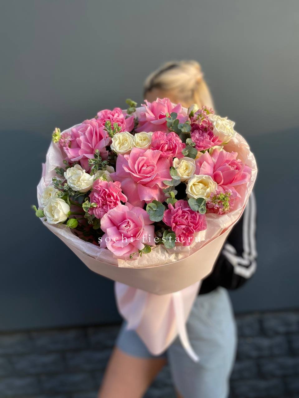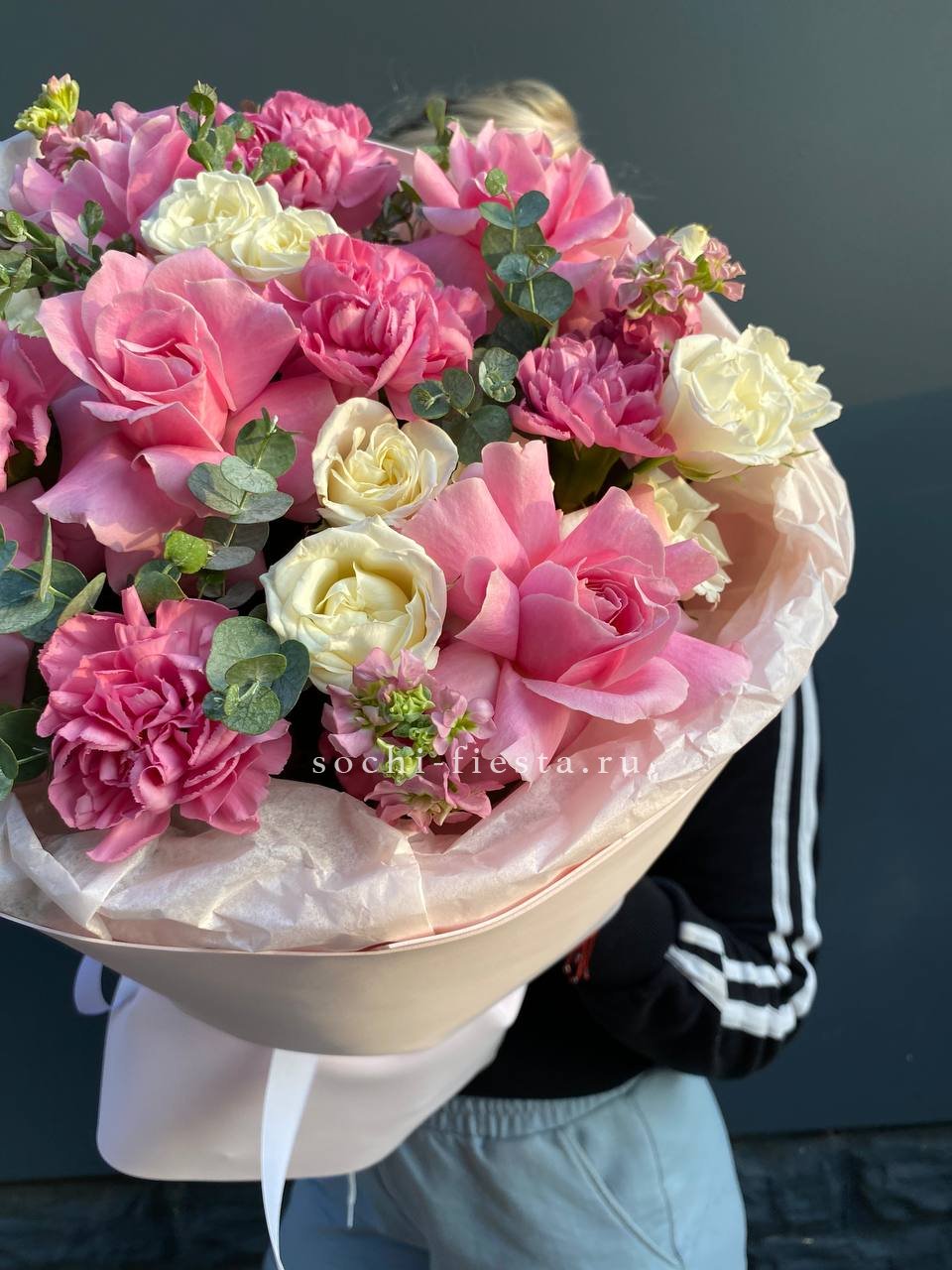 Воздушная композиция с пышными головками маттиолы и яркими диантусами создаёт лёгкое весеннее настроение. Каждый бутон раскрывается по-своему, добавляя объём и живую динамику всему букету.