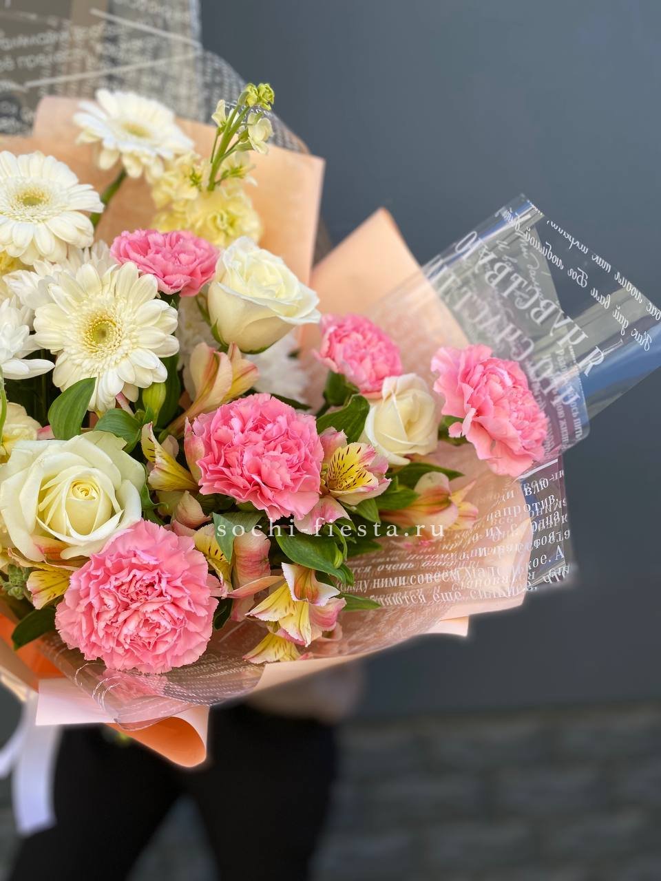 маттиола ,белые розы, хризантемы герберы, альстромерии, диантусы, лента и дизайнерская пленка.