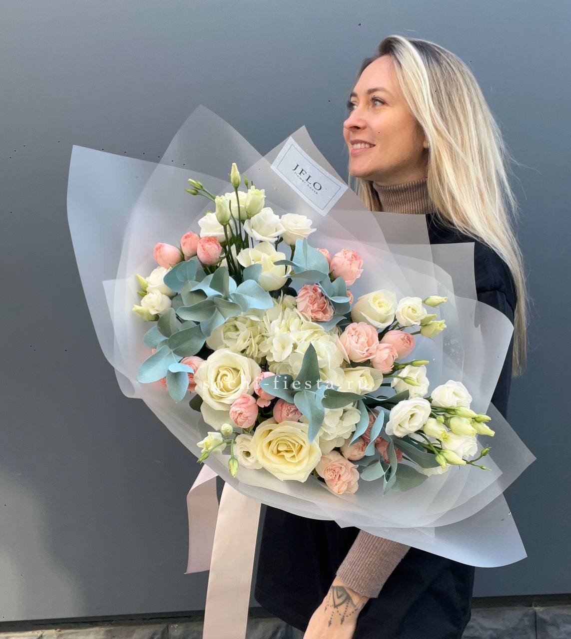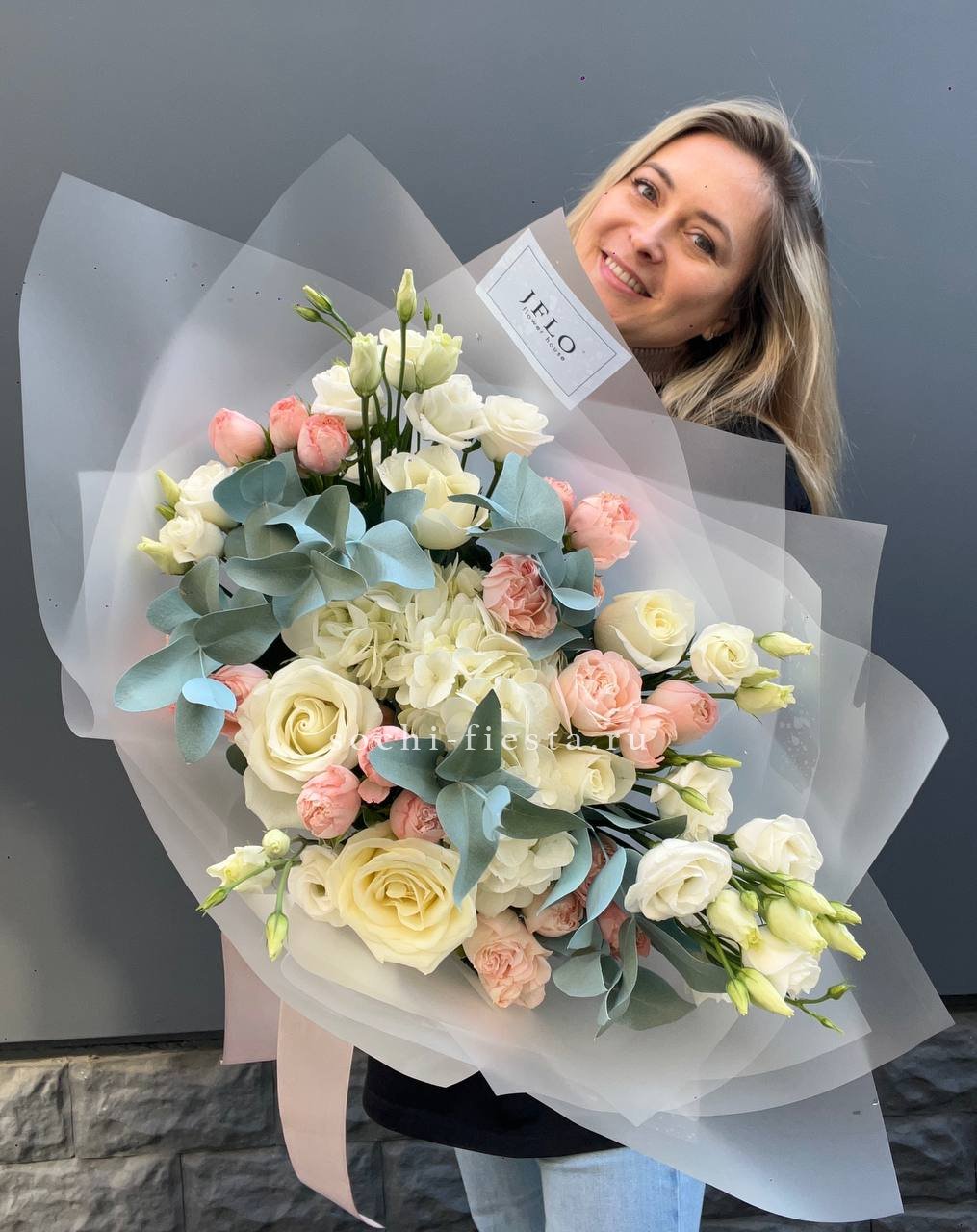 пионы (или аналог вне сезона), лимониум, маттиола, мисти баблс, эустома, эвкалипт, лента, упаковка.