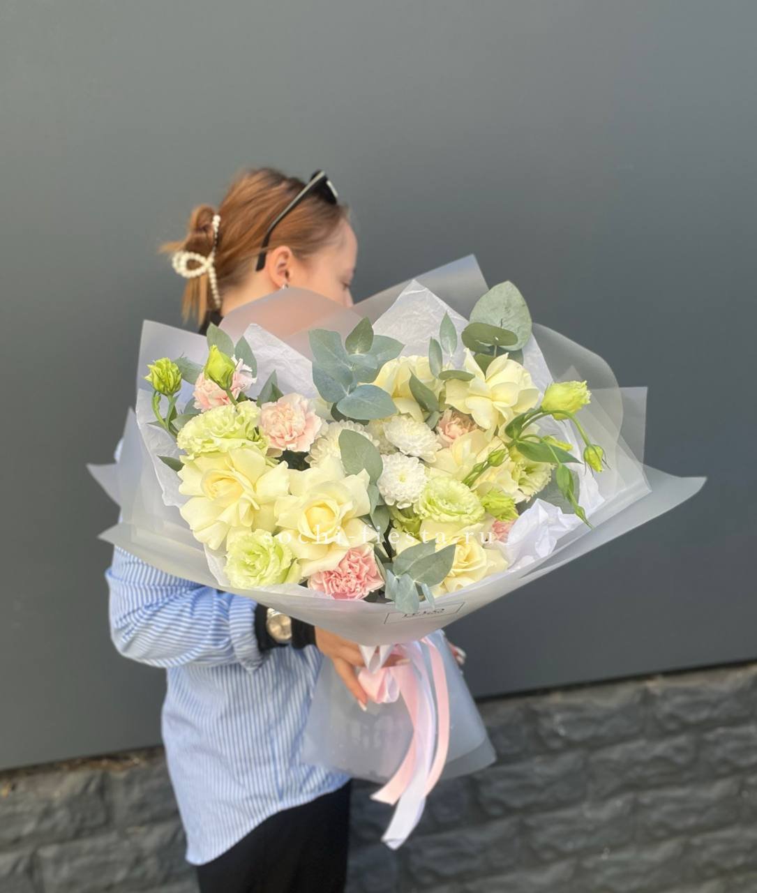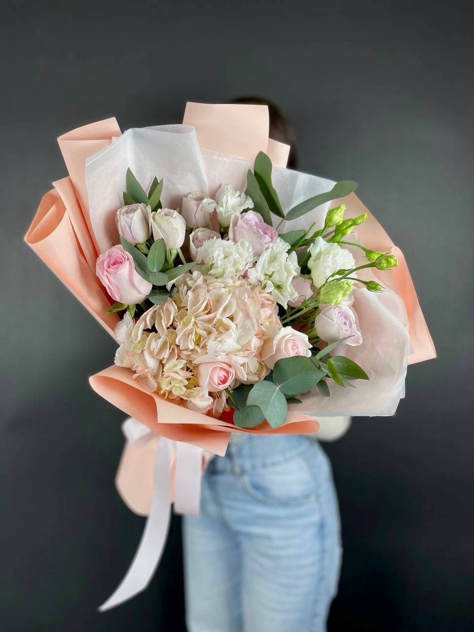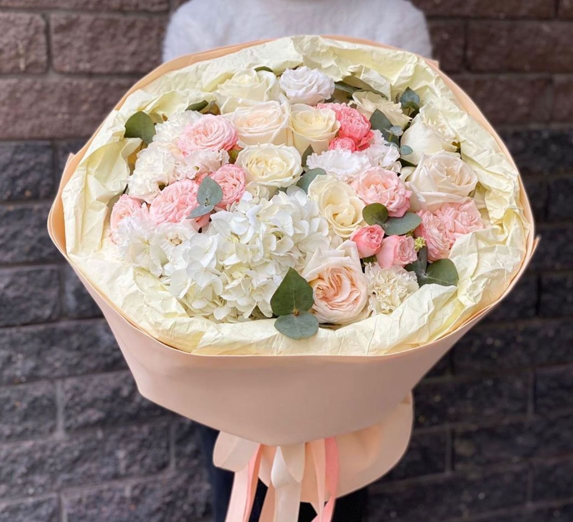 гортензия, розы, эустома, кустовая пионовидная роза, эвкалипт, лента, дизайнерская упаковка.