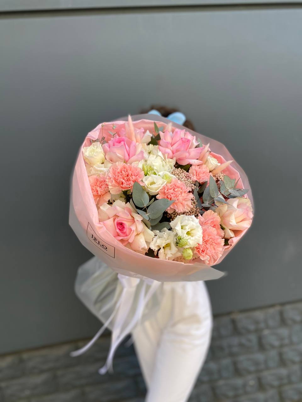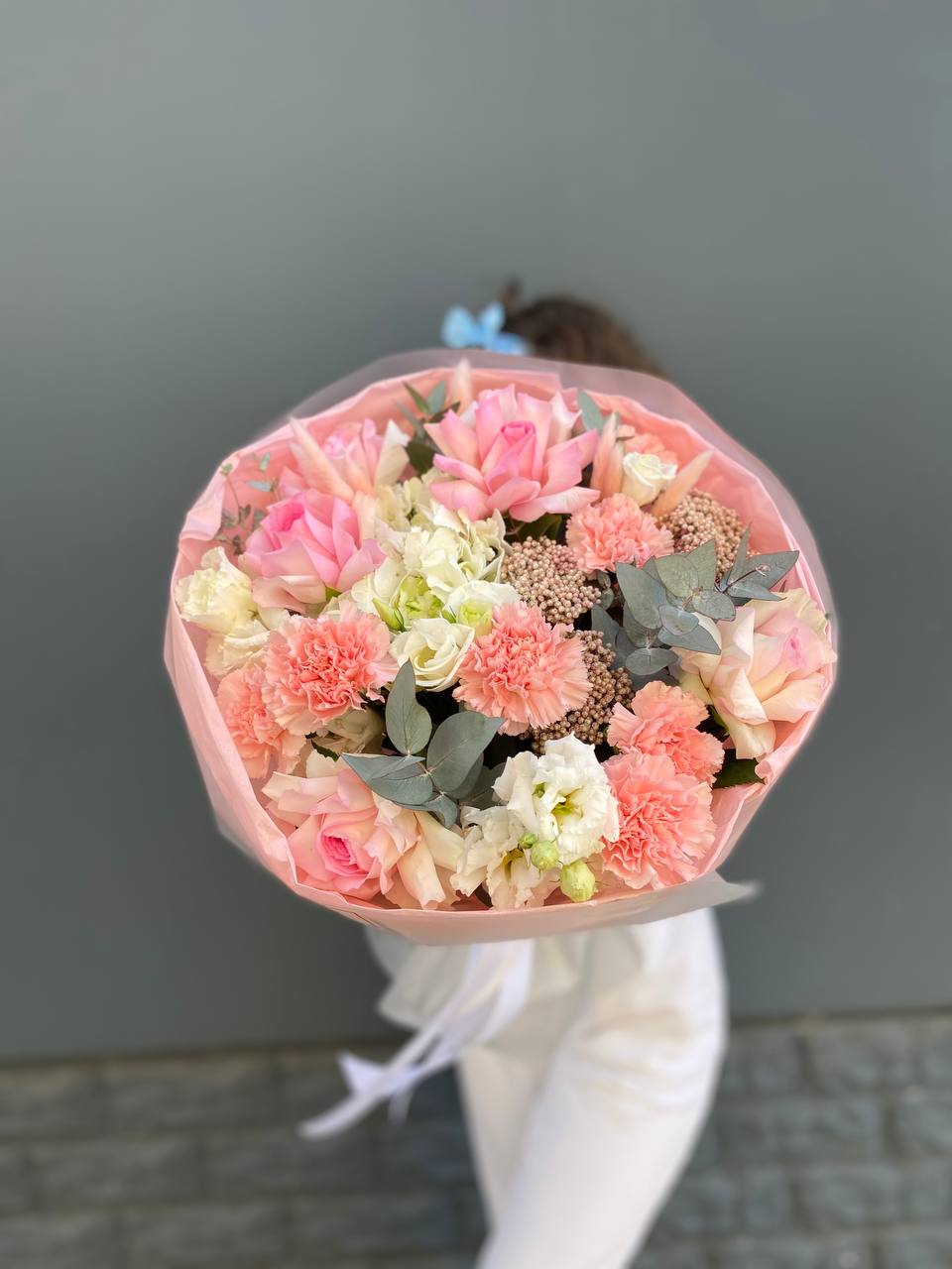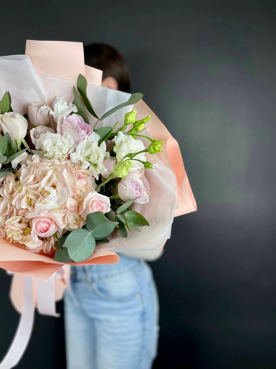 Пышные шапки гортензии задают основной объём, а бутоны роз и эустомы расставлены между ними с лёгкой небрежностью. Эвкалипт добавляет свежести и делает композицию живой.