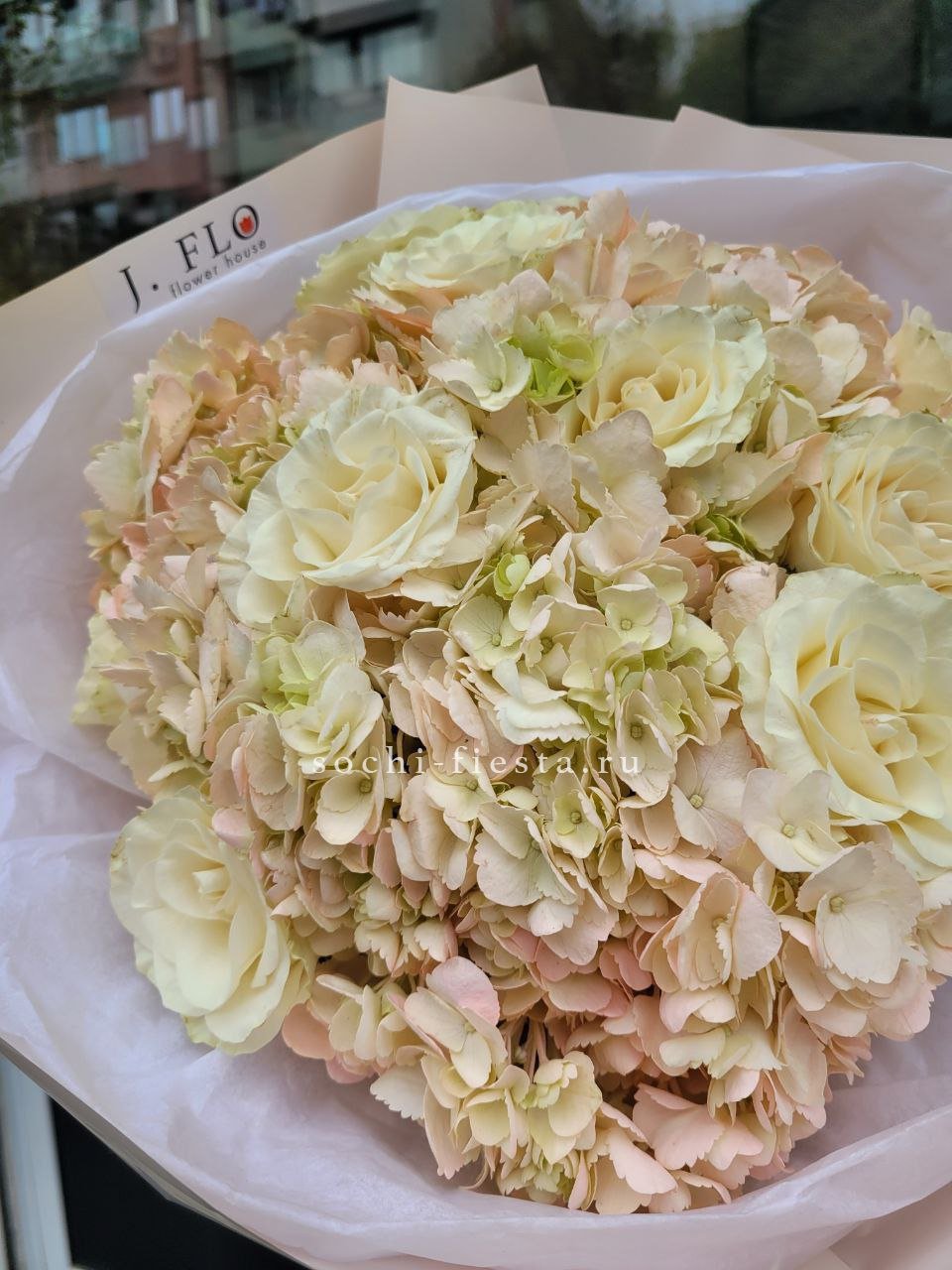 гортензия, бруния, эустома, герберы, розы, аспарагус, эвкалипт, дизайнерское оформление.
