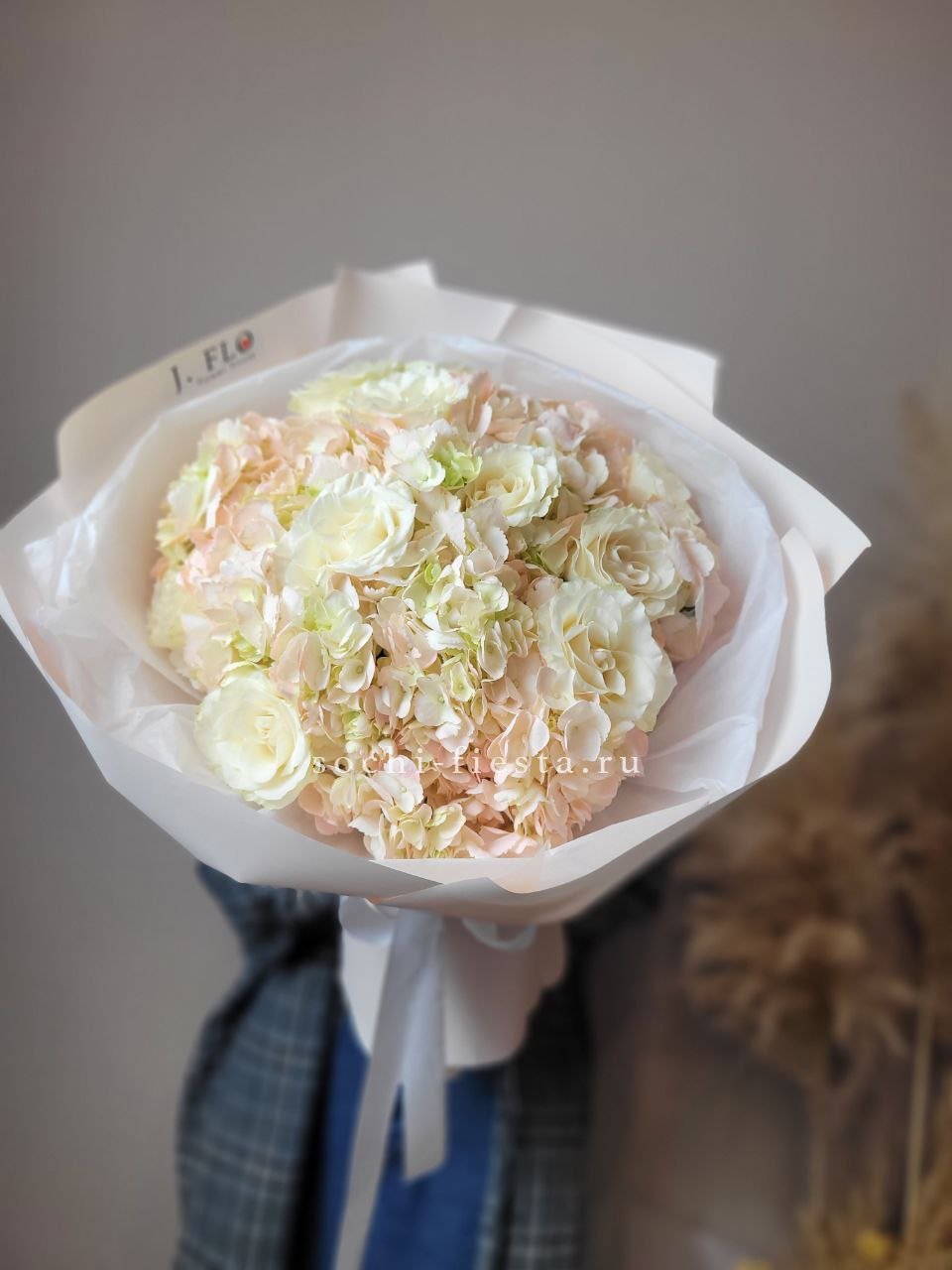 Светло-розовая палитра раскрывается от пудровых роз до свежих гербер. Бруния и аспарагус добавляют фактурные детали, а гортензия мягко завершает цветовую гамму.