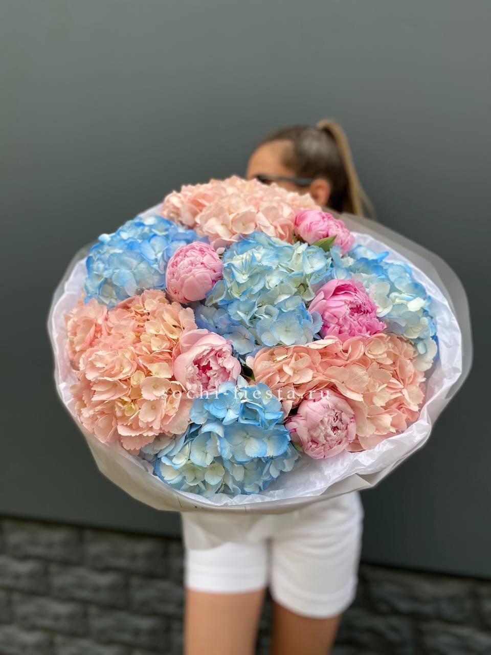 Два отдельных букета в одной композиции: пышные головки гортензий и густомахровые пионы. Каждая часть завернута в тишью и пленку, сохраняя свою форму и свежесть.