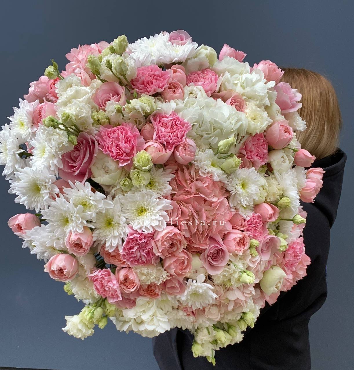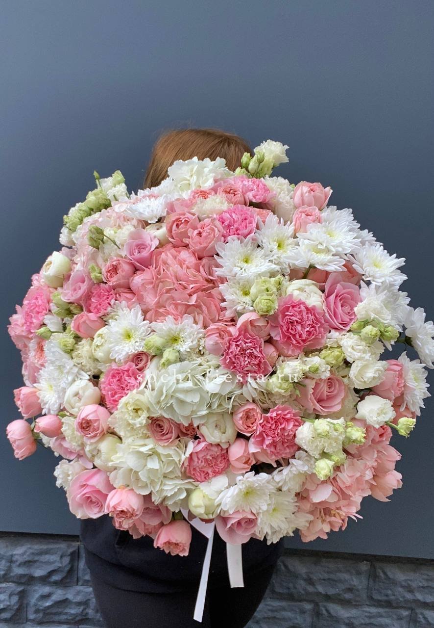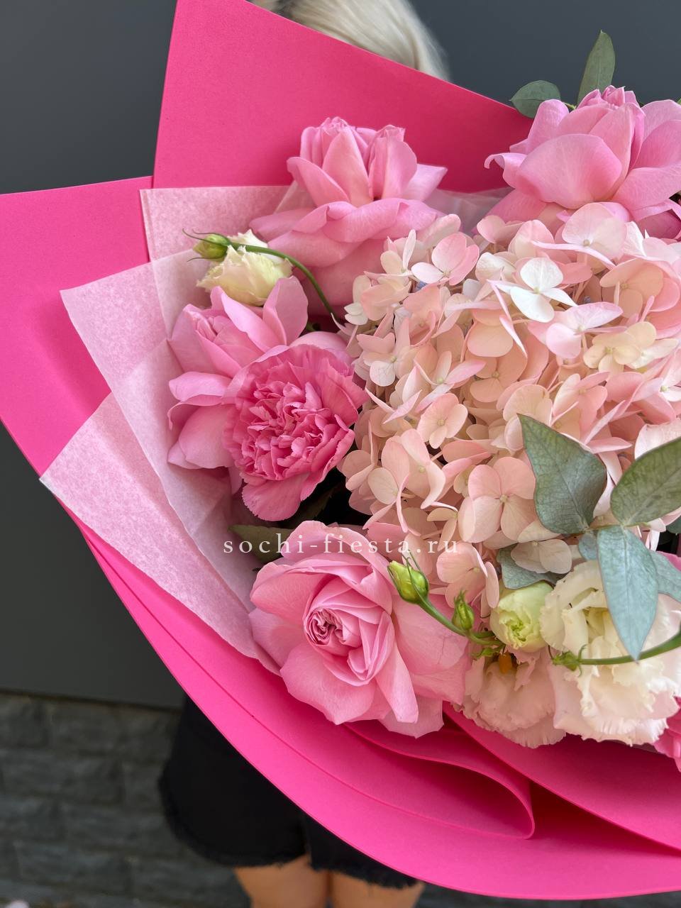 гортензия, розы, диантусы, хризантема, пионы (или пионовидные розы), эустома, корзина. Состав может меняться, в зависимости от сезона.