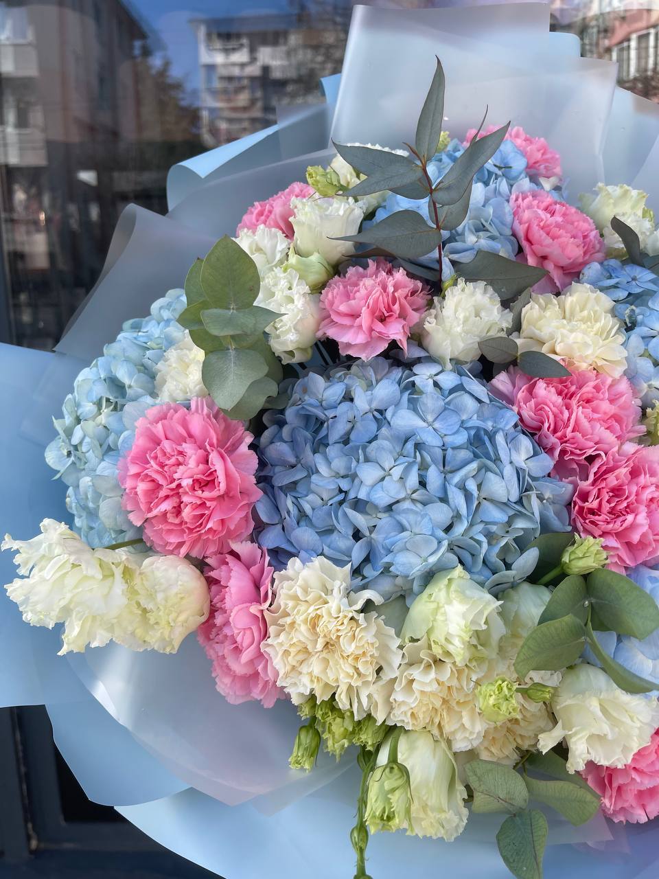 гортензия, эустома, диантус, эвкалипт, пленка.