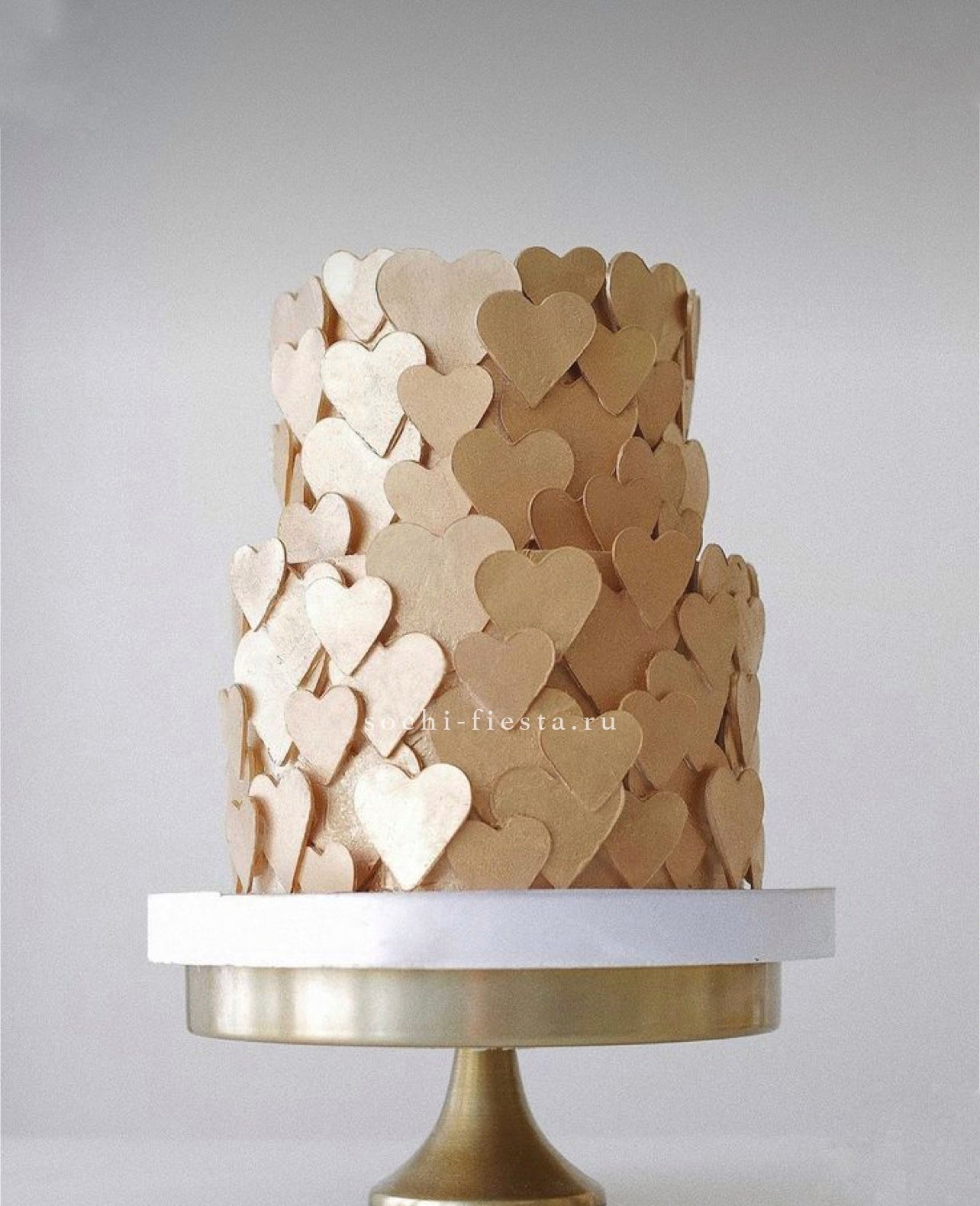 Золотые сердца на белоснежной поверхности задают графичный ритм композиции. Двухкилограммовый торт впечатляет объемом и предлагает три варианта начинки на выбор. Декор включен и продуман до мелочей.
